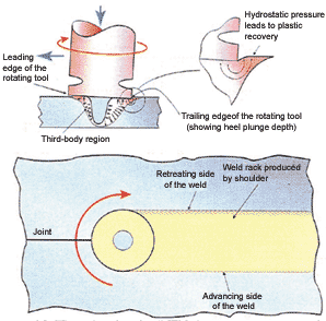 本設(shè)備是利用一個(gè)工具頭,通過(guò)馬達(dá)驅(qū)動(dòng)旋轉(zhuǎn),在工具頭通過(guò)兩個(gè)金屬接觸面的時(shí)候,因摩擦產(chǎn)生的的熱量,將兩個(gè)金屬軟化實(shí)現(xiàn)固態(tài)焊接,工具頭按照預(yù)先設(shè)定的路線穿過(guò)金屬接觸面,金屬在穿過(guò)的時(shí)候冷卻就完成了固態(tài)的焊接。在焊接過(guò)程中金屬?zèng)]有達(dá)到熔點(diǎn)的情況下進(jìn)行的。